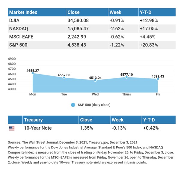 Stock prices were volatile all week, swinging wildly after staging a modest recovery to begin the week. Omicron fears were not the only issue weighing on investors. Markets were also rattled by Fed Chair Powell’s Congressional testimony stating conditions warranted considering an acceleration of its bond purchase taper schedule. Last week’s roller-coaster action was epitomized on Wednesday when stocks rallied intraday by 520 points on the Dow Industrials, only to close the session lower by 460 points.4
