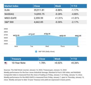 The Dow Jones Industrial Average lost 0.88%, while the Standard & Poor’s 500 slipped 0.30%. The Nasdaq Composite index fell 0.28% for the week. The MSCI EAFE index, which tracks developed overseas stock markets, gained 1.31%.1,2,3