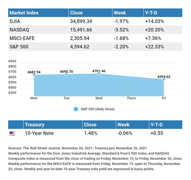 Friday’s market action saw declines in economic reopening stocks, such as travel and leisure, cyclicals, financials, and energy, while some of the so-called stay-at-home stocks and pharmaceutical stocks experienced gains. Yields retreated amid a flight to safety and the potential that this turn of events may lead to a slowdown in the Fed’s bond tapering program and a delay in contemplated rate hikes. Prior to Thanksgiving the markets had been choppy, but largely trending higher for the week, while yields had moved up with the renomination of Fed Chair Powell.